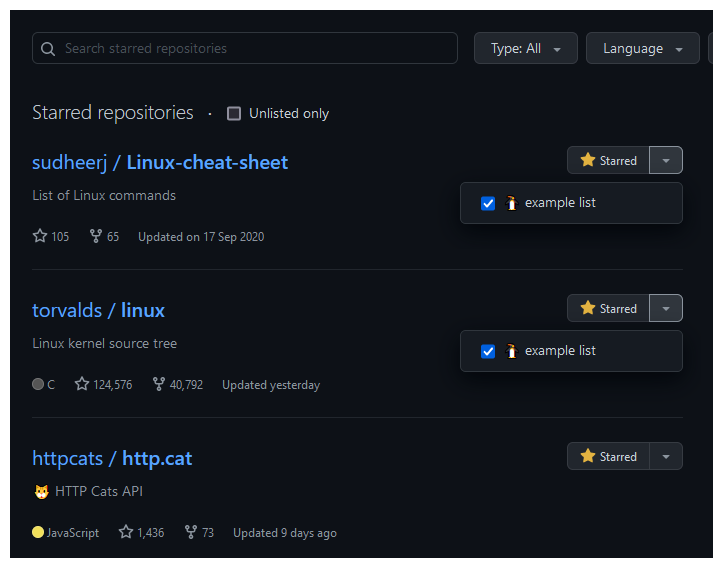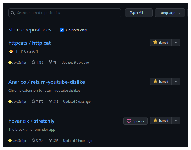 Hi! I was facing the same issue with having a lot of stars and not knowing which are unlisted. I created a bash script to get a user's stars and lists and find the unlisted stars. I tested this on my profile and it worked well to output the unlisted repos. Just linking it here if anybody finds it interesting and wants to try it out: |