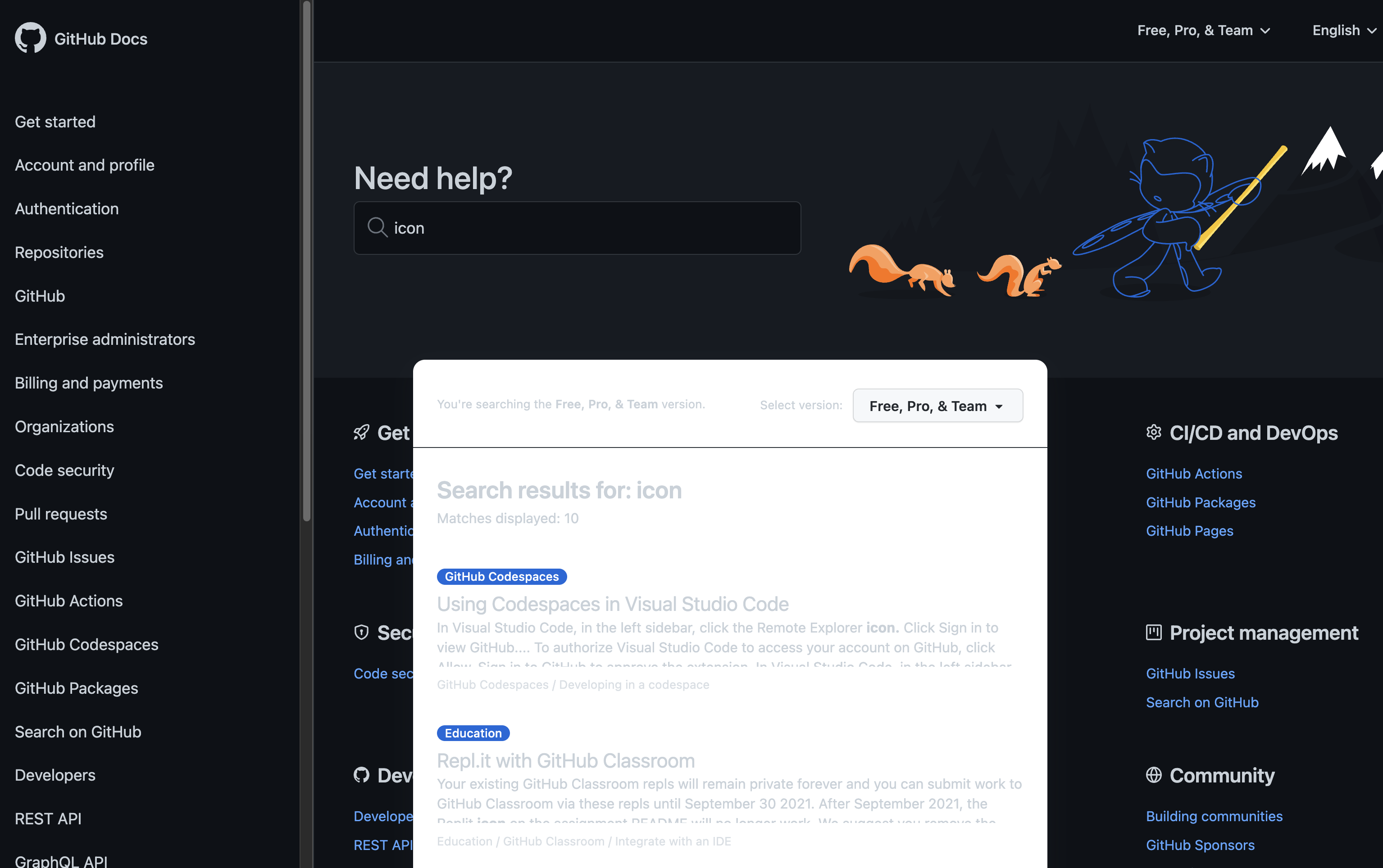 It does help. My problem was that I assumed there would be some link to the main docs page via the menu I get by clicking on my profile picture. It has GitHub Support and GitHub Community right there, but no link to GitHub Docs. That's weird, right? And I didn't know the URL was just docs.github.com . Mystery solved, I guess, and yes, the bug is fixed. |