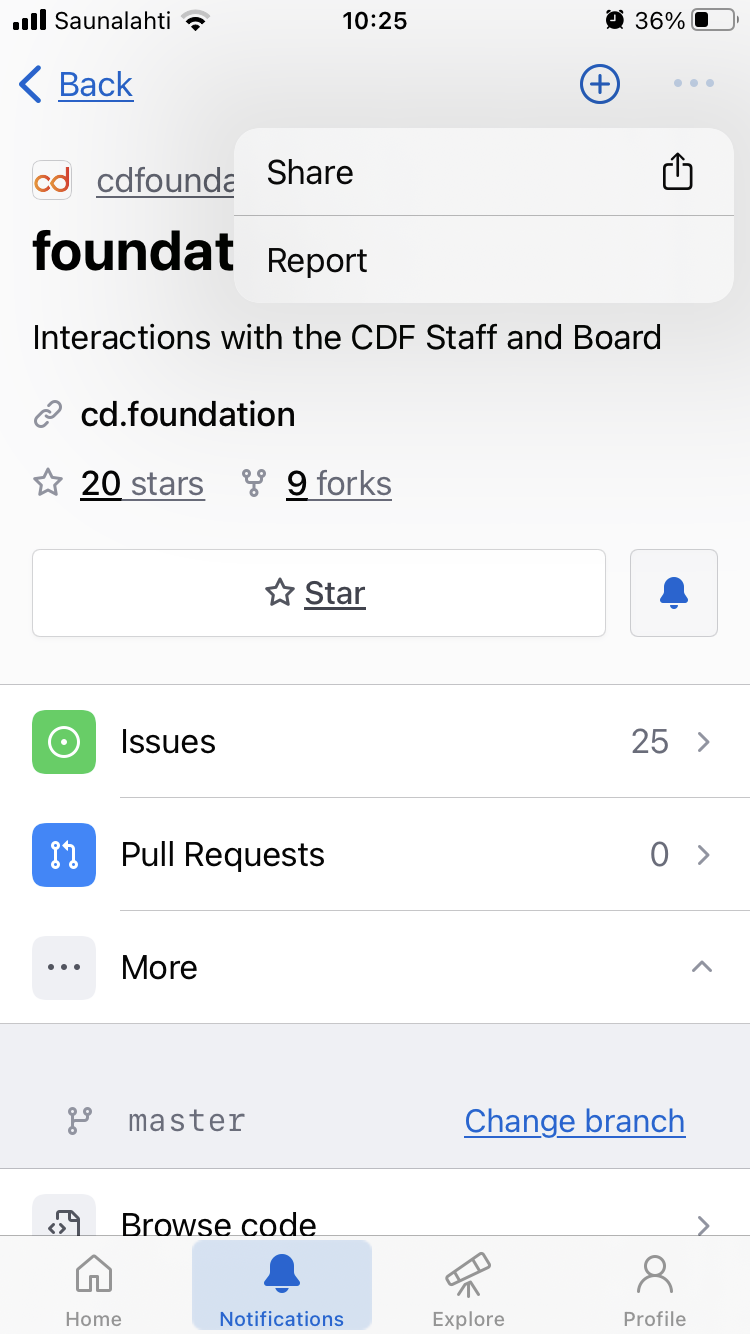 Using the GitHub 1.57.0 app on iOS, I subscribed to a few individual issues in a repository by clicking the ellipsis button at the top right corner and choosing "Subscribe" from the menu. I then wanted to subscribe to all issues in that repository, navigated to the repository page, and clicked the ellipsis button there, but the pop up menu had no "Subscribe" option in it. It took me a while to find that I had to click the bell button at the right side of the star button, instead.