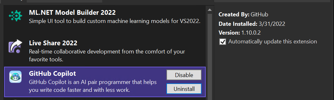 I installed Copilot in VS 2022 (did not activate), restarted Visual Studio and did not open a project - I went into Edit | Copilot Suggestions | Settings... it locks up Visual Studio completely. Tried with VS 2022 (17.1.2) and the Preview (17.2.0-2.1) versions.