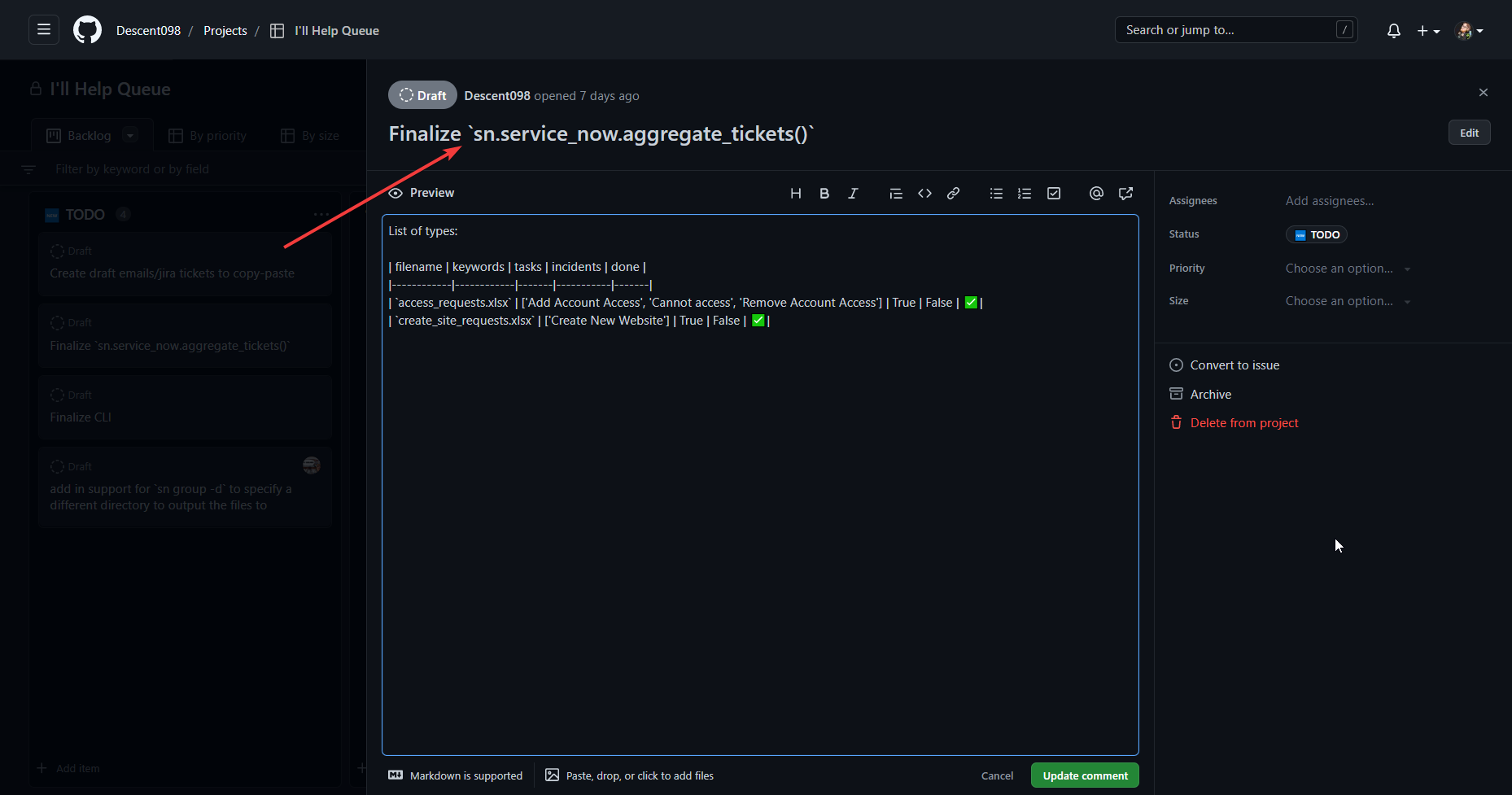 I'd really like to be able to deeplink to specific "Draft" Issues. I would think a simple implementation would be adjusting the URL when the sidebar slides out. i.e., But I suspect the deeper issue is that these Draft-not-quite-Issues don't actually have publicly-visible IDs the way that Issues do! 😢 In any case, I need to be able to pass a URL to someone and say "please look at this Draft issue" and that's currently not possible, unless I'm missing something. |