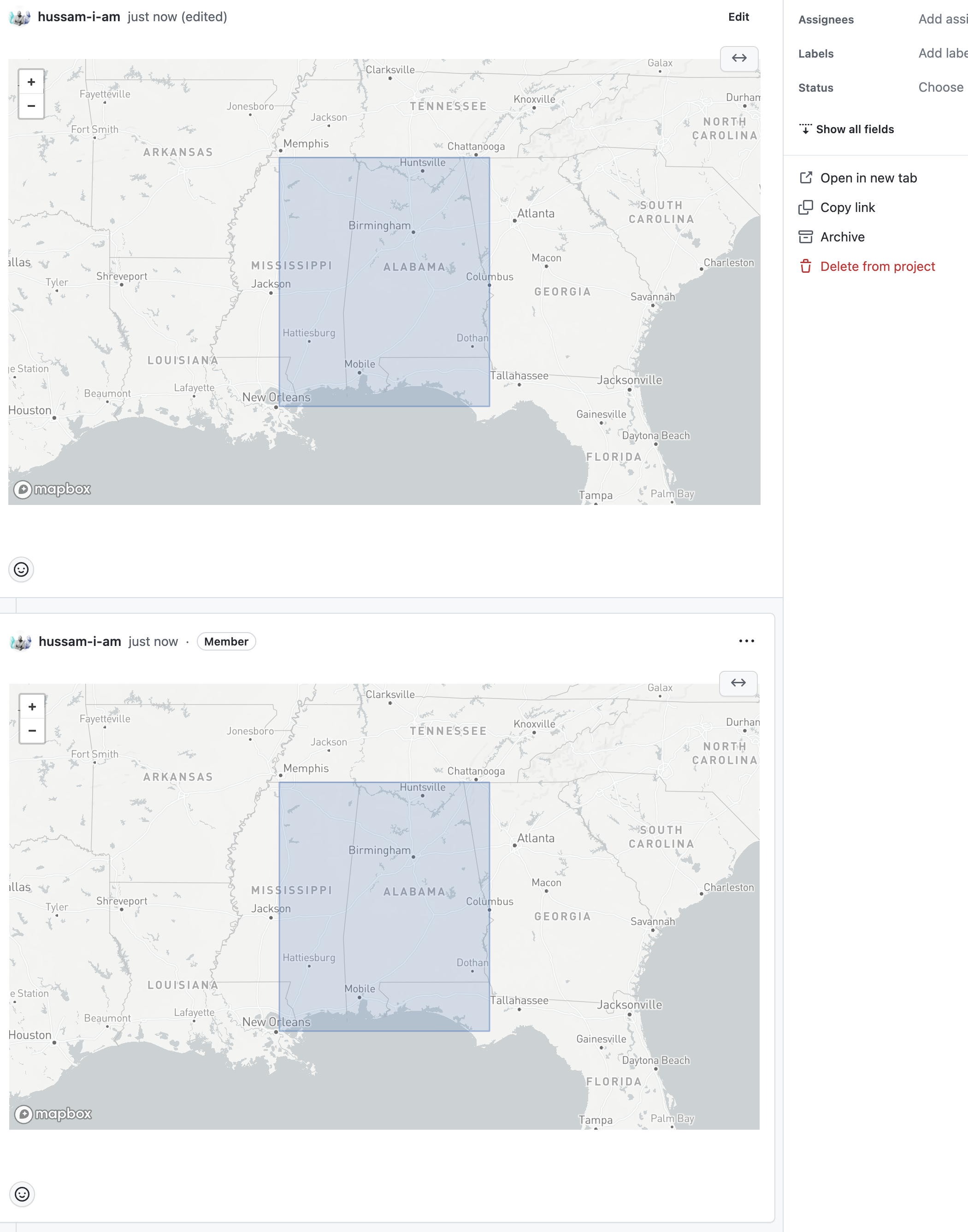 Note that only GeoJSON in comments causes this problem - embedding in the issue itself works fine. |