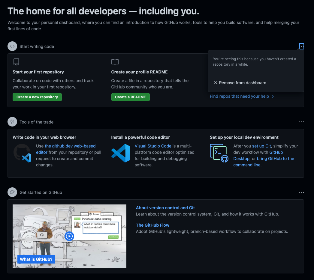 I just noticed a new personal dashboard and it falsely shows a "Start Writing Code" section with the reason