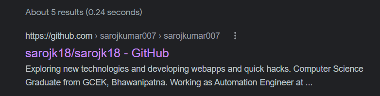 Hi @sarojk18, you would have to wait till Google reindex/crawls your GitHub webpage again for the updated changes. Perhaps you can check again on your end in the next couple of hours/days. It really depends on when Google reindexes or crawls your website. Hope this clarifies. |