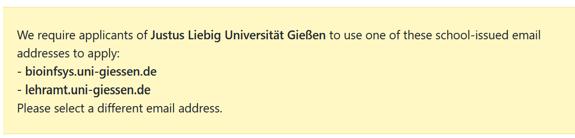 So my university has different mail adresses depending on what subject you study. I study German, so my mail adress is Firstname.Lastname@germanistik.uni-giessen.de. When applying for Student Benefits, I was told that my mail adress is incorrect and that ONLY mail adresses ending in @bioinfsys.uni-giessen.de or @lehramt.uni-giessen.de are accepted. Which means only 2 out of like 50+ different mail subdomains from my Uni can access the Student Benefits program. Suggested fix: @*.uni-giessen.de |