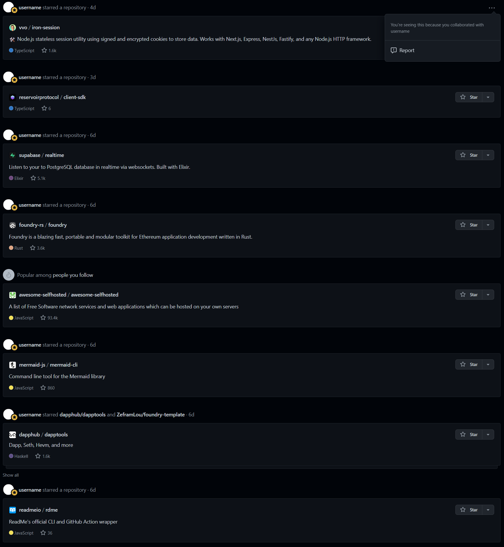 Hi! I wanted to say that I'm quite liking the "For you" section, but I feel that GitHub needs to give more control over it. Just because I used to work/collaborated with someone in the past doesn't mean that I'm interested on which repos they star/follow/etc. For example, I have this one ex-coworker (that I don't follow) that seems to mass-star repositories and what ends up happening is that my "For you" feed feels more like "About username". It would be nice to be able to "hide" the actions of certain users without having straight up blocking them. |