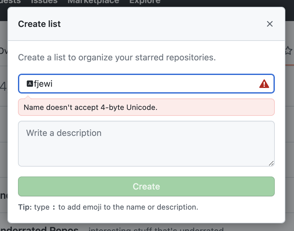 When creating a new list on the Android GitHub app, you cannot use the This probably happens because it's a weird emoji lol. |