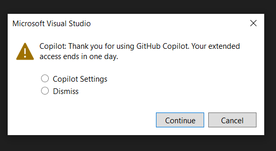It seems every time CoPilot is triggered by VS2022 it has to open a modal popup to tell me that it expires in one day. I've dismissed it about 20 times so far this morning.