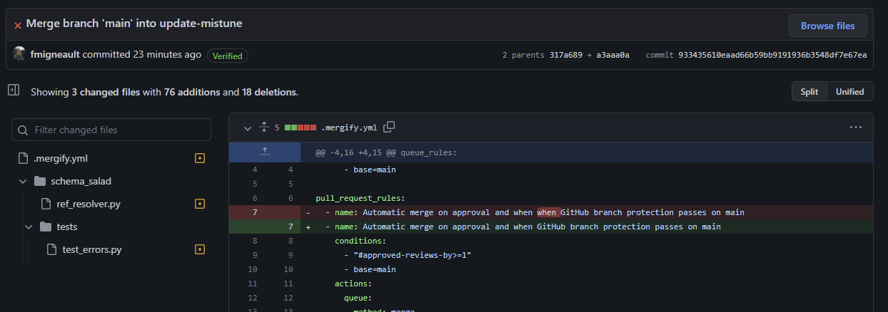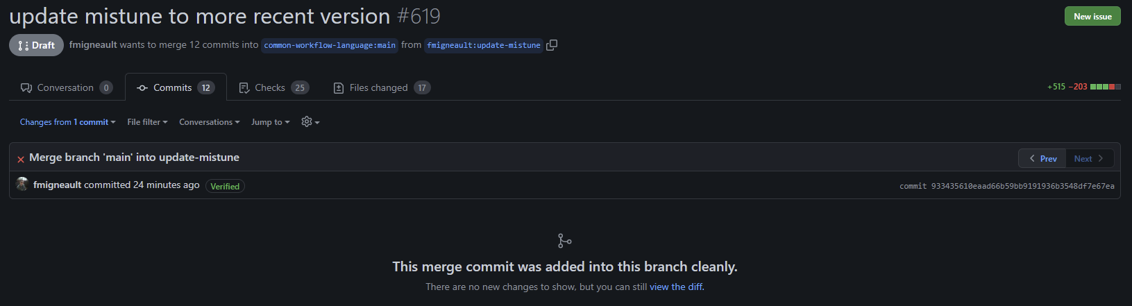 Note that this result can be achieved by clicking the "view the diff" link at the bottom of the commits list (see above image), but that seems like an unnecessary additional step. That link is also not that obvious to spot if there are a lot of commits, since it goes all the way at the bottom of the page.