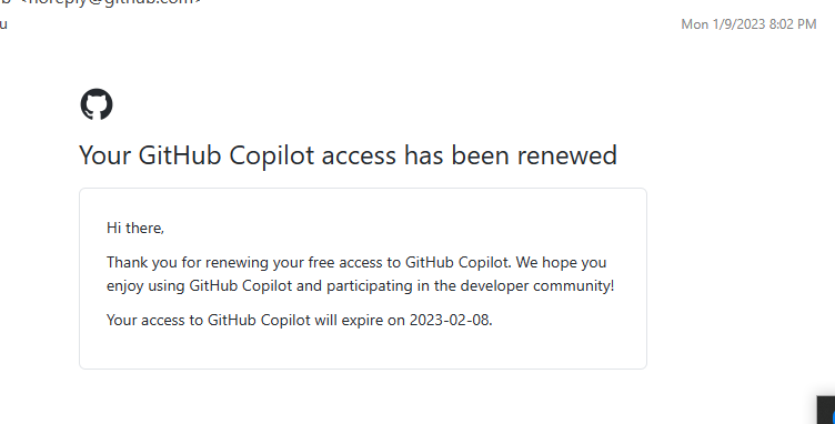 I was getting this email on 9-Jan-2023, and was able to use copilot normally until the 11th. I have been renewed until 08-Feb-2023, but I am unable to use copilot from today 12-Jan-2023, even though the renewal has not expired!