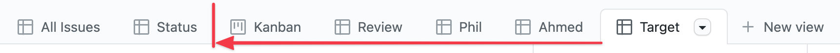 The tabs that appear at the top of the new Projects (beta) board which represent different views seem to be positioned in the order that they're created. I find myself wanting to re-order them after I've created them. I see both semantic ordering and "default tab" as plausible options. However, since "Default tab" could be inferred by having it be the "first" tab, I think I'm just hoping for the ability to reorder them, similar to how "fields" can have their options sorted. |