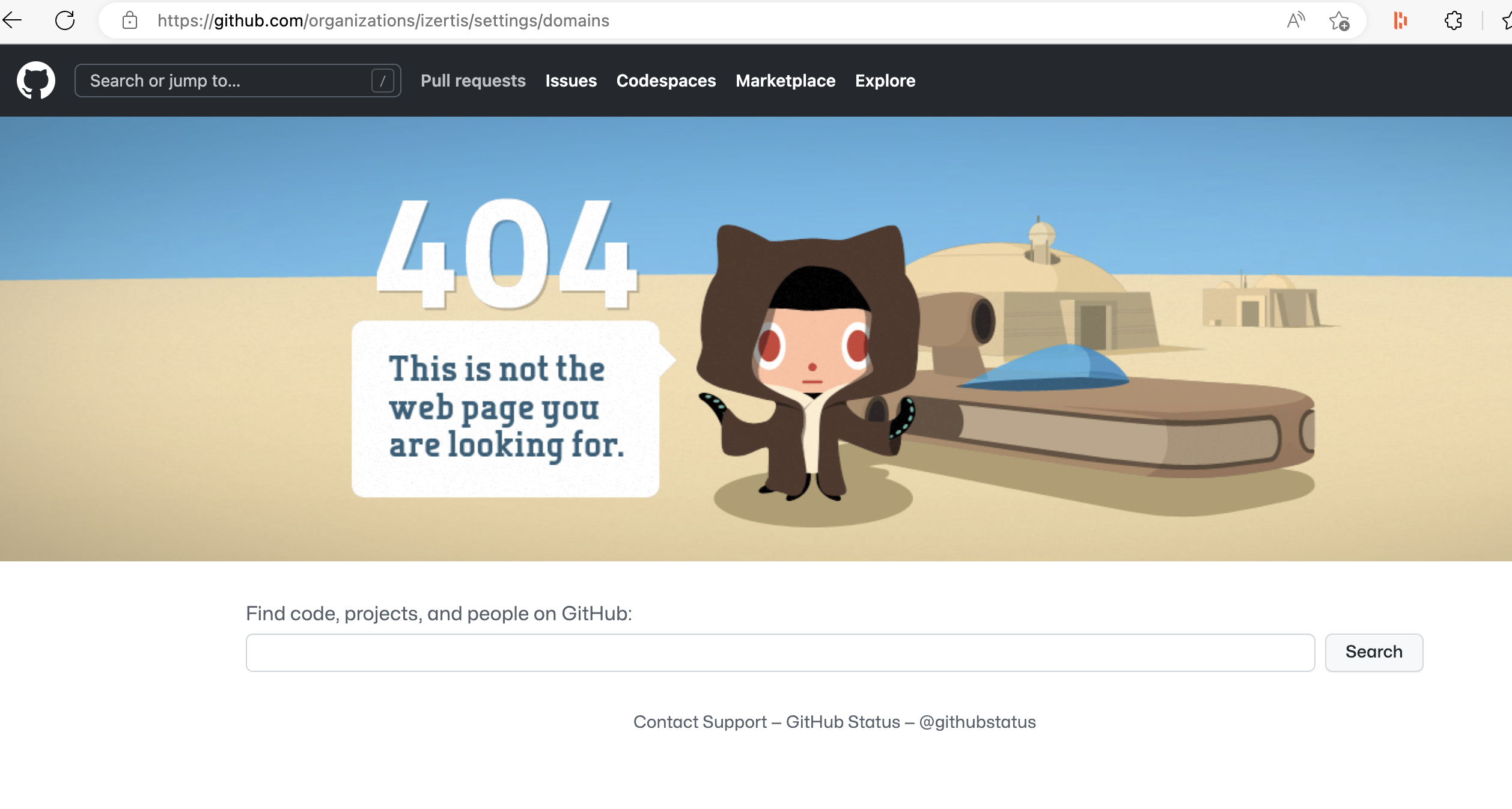 When I clic on "Domain verification" > "Review", it navigate to https://github.com/organizations/myorg/settings/domains (substitute myorg by an organization name) and I get a 404.