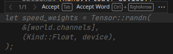 accept wordwithctrl+right arrow. But with the last vscode version this is in conflict with{ "key": "ctrl+right", "command": "cursorWordEndRight", "when": "textInputFocus" }Disabling