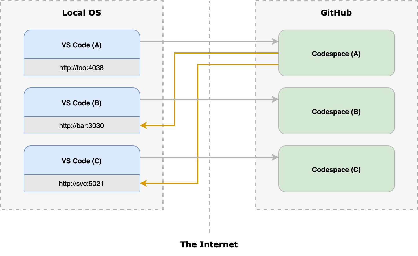 Thanks! These were informative to read and learn, however, I'm not sure it will work for us since it seems to create a kitchen sink that would encompass all the dependencies needed for each project. Our organization has > 100 applications/repositories that are mostly HTTP services. Most of these projects are developed in isolation, meaning each can implement Codespaces and their devcontainer implementation in an isolated fashion. In some cases, a single service (A) may need work to one or more (B) and (C) HTTP services. If these projects were local, that would be easy to do. Simply change a config in service (A) to point to the local version of (B) and (C). See illustration of what we would need from Codespaces to make this work. Basically, can the SSH tunnel (or whatever mechanics are at play) facilitate port requests back to the Local OS? |